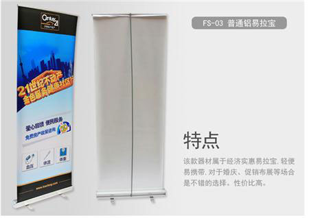 易拉寶特點(diǎn): 合金材料,造型簡(jiǎn) 輕巧便攜,方便運(yùn)輸、存放 安裝簡(jiǎn)易,操作方便 經(jīng)濟(jì)實(shí)用,可多次更換畫(huà)面。